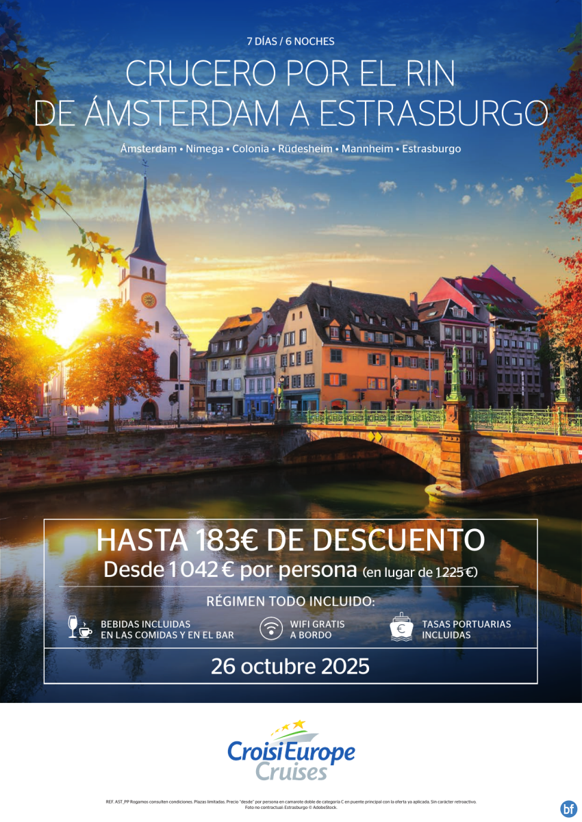 Hasta 183€ DESCUENTO - crucero por el Rin de Ámsterdam a Estrasburgo - 7 días - Todo Incluido - 26/10